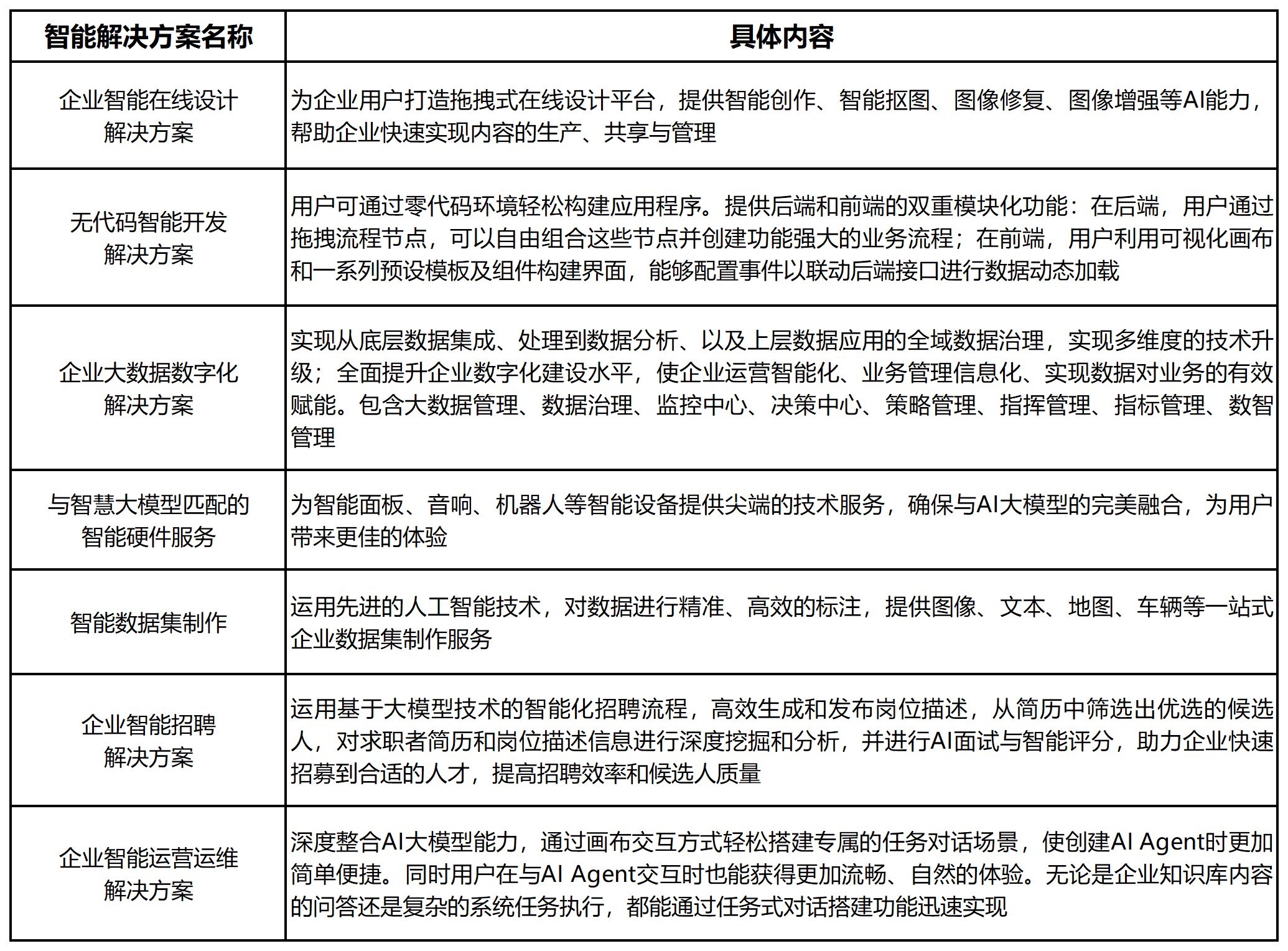 金沙9001以诚为本凭借在大数据和AI大模型应用领域的技术积累,计划研发面向企业应用场景的智能解决方案相应业务模块平台,解决企业在数字化转型过程中面临的挑战,帮助客户实现生产力、运营、管理、决策智能化,助力企业数据流转和资产化,为客户形成新质生产力。金沙9001以诚为本智能解决方案建设的具体内容包括新增“企业智能在线设计解决方案”、“无代码智能开发解决方案”、“企业大数据数字化解决方案”、“与智慧大模型匹配的智能硬件服务”和“智能数据集制作”,并全新升级“企业智能招聘解决方案”和“企业智能运营运维解决方案”,形成一体化、全方位的AI技术服务体系。