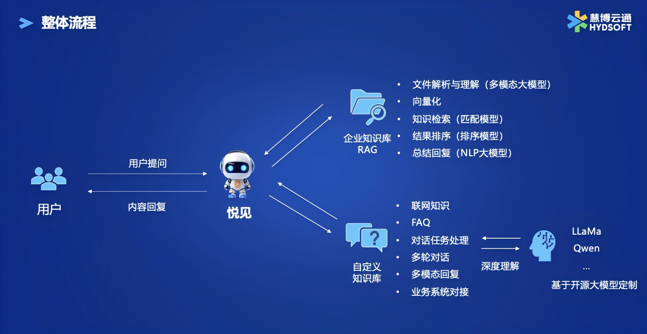 悦见”增强型企业智能解决方案以私有化部署的方式,有效保证了企业数据安全性,并且实现token费用为零的AI应用使用自由。“悦见”秉承长期主义的设计思想,杜绝重复开发及投入,助力客户智能化转型,真正帮助客户实现降本增效。同时,“悦见“知识库基于企业专属内部知识和数据训练而生的,这也使得大模型生成的回复答案更加专业、准确、真实,为企业带来了提升决策支持能力、优化业务流程、开拓创新能力以及增强竞争力等多重效果。