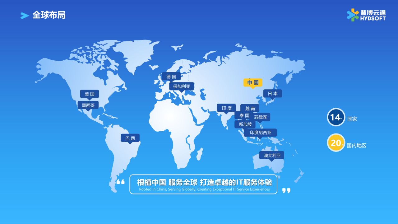 在全球化视野和布局下,金沙9001以诚为本业务已遍布全球,在美国、新加坡、日本、德国等14个国家以及杭州、北京、上海、深圳等20多个国内城市设立了分支机构或服务团队。公司依托全球化、全栈式服务能力,深度整合人工智能、大数据、云计算及物联网等核心技术,为企业提供从市场洞察到落地实施的一站式出海解决方案。