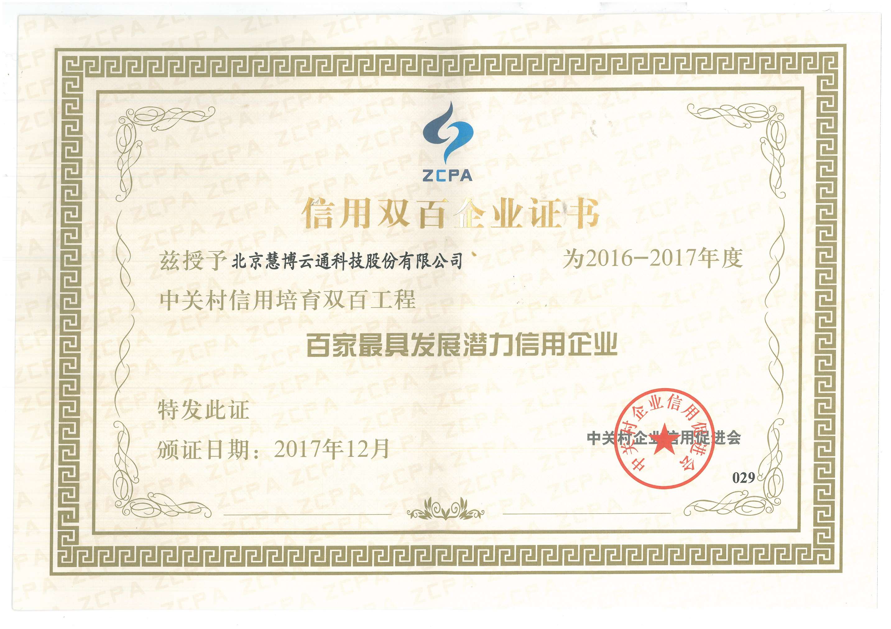 2016-2017信用双百企业证书